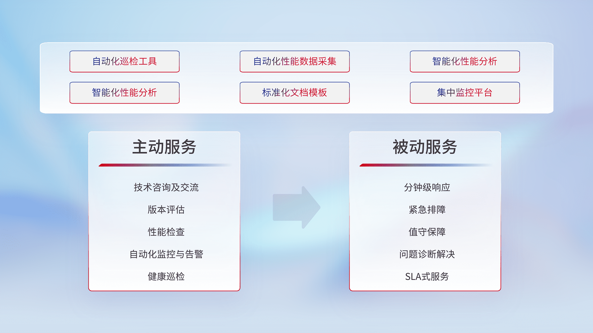 智能化工具和标准化文档,,保障服务质量,,提供主动服务(包含技术咨询、、、、版本评估、、性能检查、、自动化监控与告警、、、健康巡检)和被动服务包含(分钟级响应、、紧急排障、、、、值守保障、、、问题诊断解决、、SLA服务)。。。